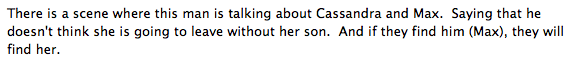 W jednej ze scen jakiś mężczyzna mówi o Cassandrze i Maxie. Uznaje, iż nie ma możliwości, by Cassandra wyjechała bez syna. Dochodzi do wniosku, iż by znaleźć Cassandrę, muszą znaleźć Maxa.