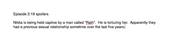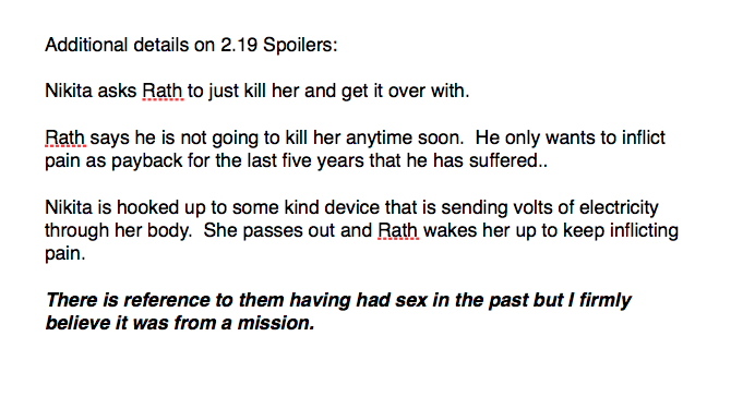 Nikita jest przetrzymywana przez mężczyznę zwanego ''Rath''. Torturuje ją. Najwyraźniej sypiali oni ze sobą kiedyś w ciągu ostatnich pięciu lat.